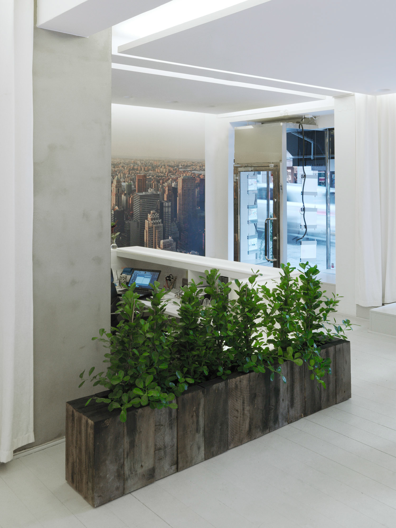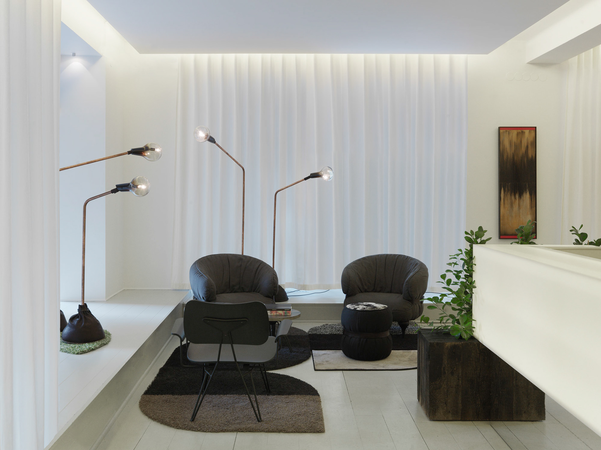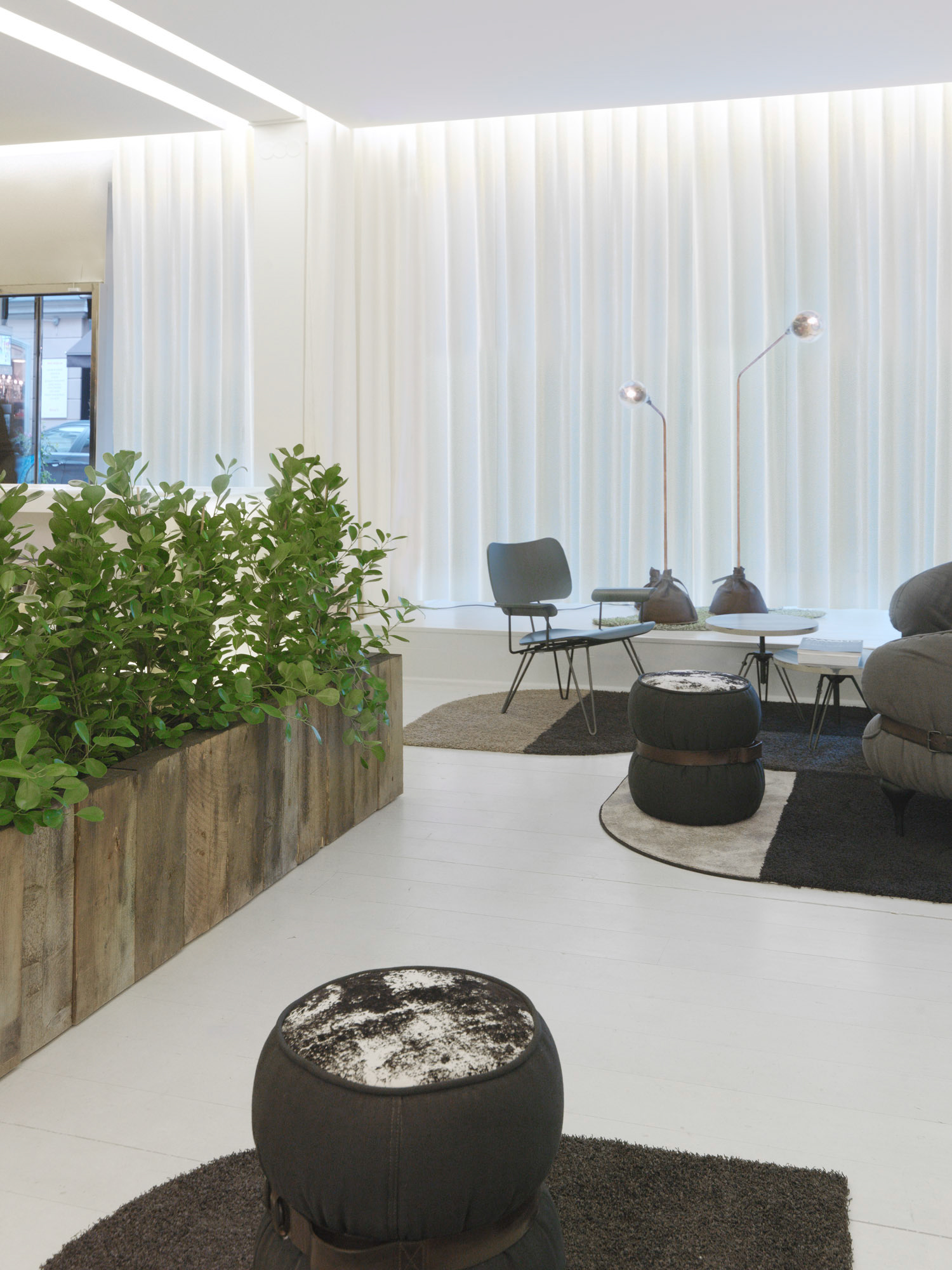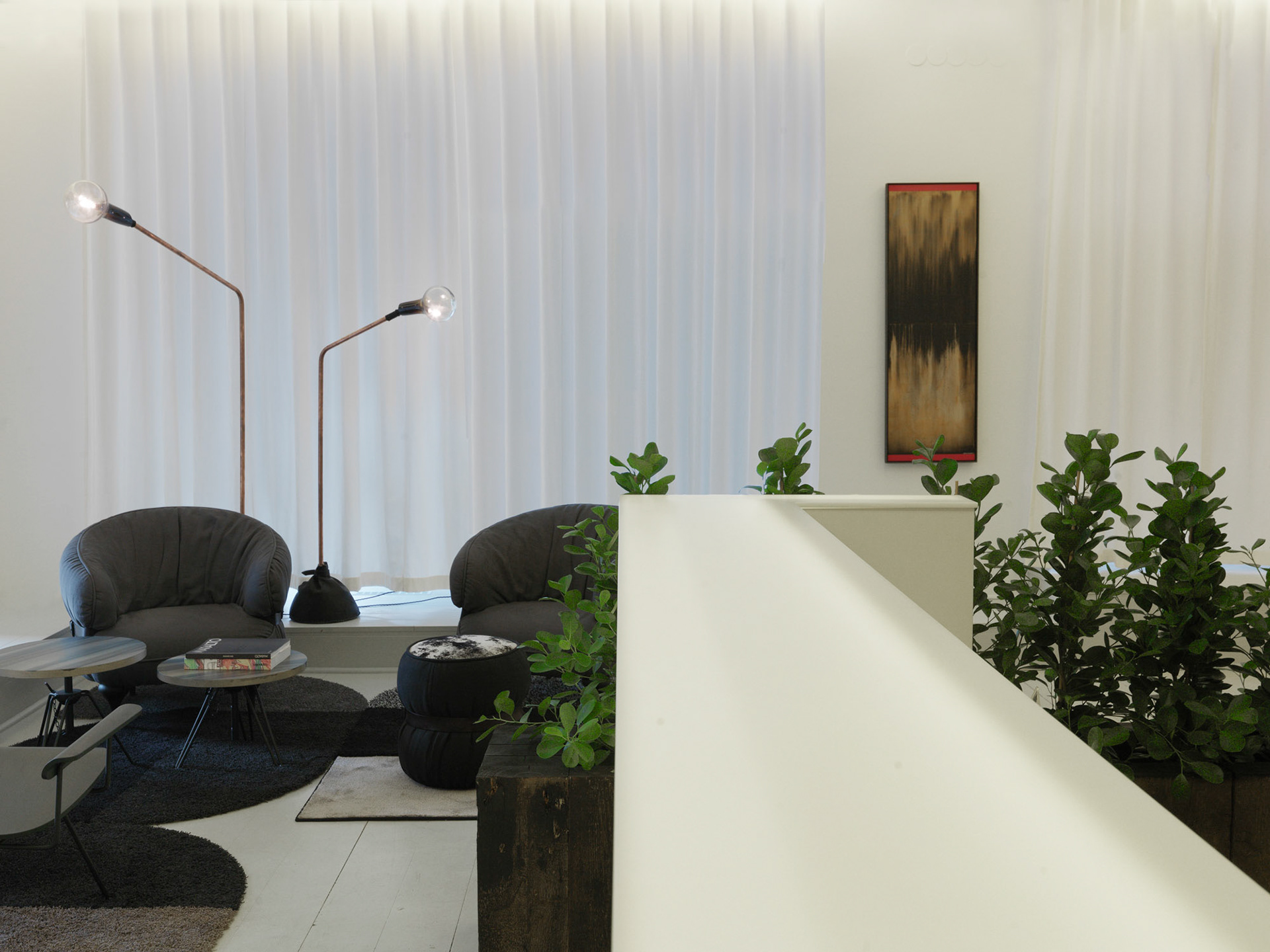 A light and open space welcomes you at ESNY’s head office at Grevgatan. The luminous reception desk hovers over the floor like a reflection in a lake. The design concept is a three-dimensional extension of the company’s brand manual and physical identity. The base colors are black, white and accent green. Snow-white walls and transparent curtains stand as contrast against dark tones and gritty structures such as concrete, wood and black leather.