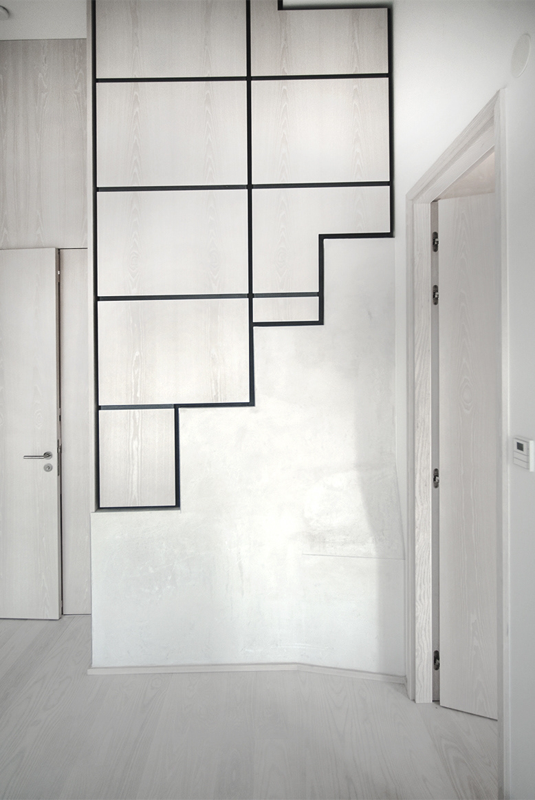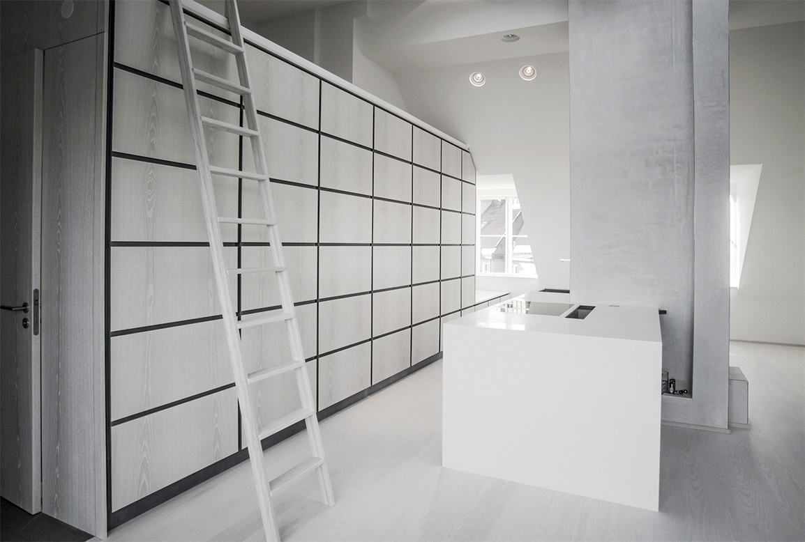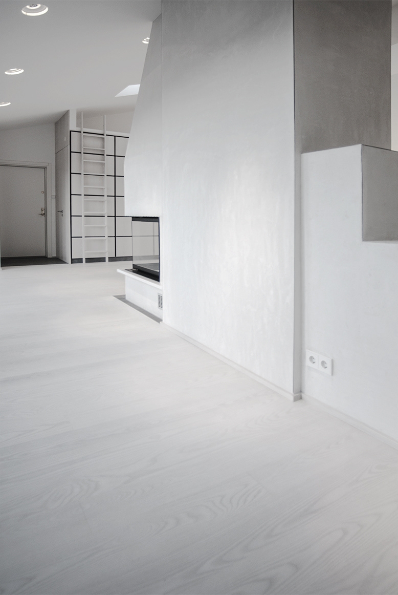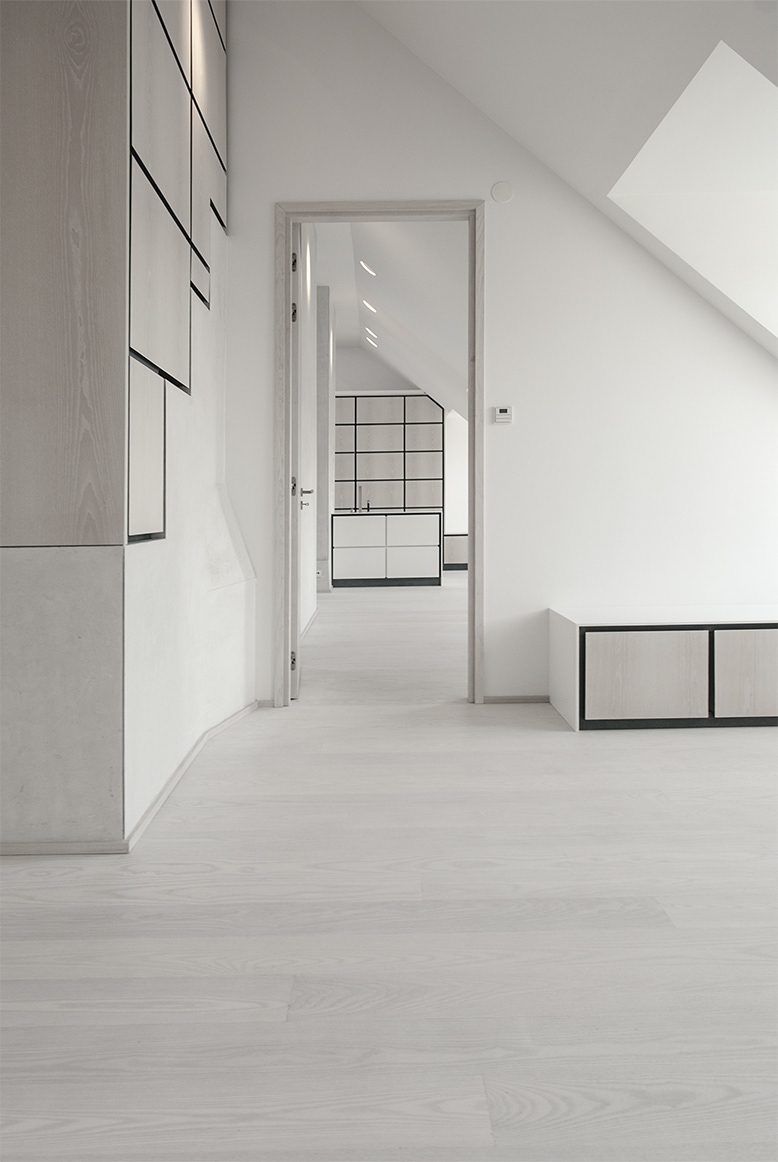 We chose solid ash for the floors and ash veneer for the doors and selected walls. The large wardrobe sections, also clad in ash veneer, are divided into strict grid patterns, something that gives stability to an interior that consists mainly of irregular shapes and angels. The combination of ash and the lime plaster on walls, pillars and chimneys is not only beautiful – it also reflects light well which is vital in spaces such as these, where daylight is more sparse than in an ordinary apartment. Combining a timeless, elegant material like carrara marble with Valchromat and Corian creates exciting contrasts in kitchens and bathrooms.