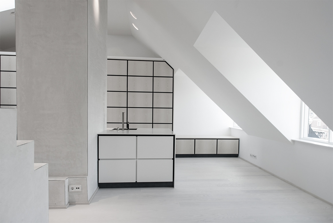 This 600 square meter attic in an 1890's building was to be converted into three apartments. To make room for the patios we had to demolish the roof, reorientate some of the chimney flues and ventilation shafts and construct a new roof. With the outer structures finished we went about working on the interior. One of the challenges was to make good use of the sloping ceilings and chimneys to make them integral parts of the interior. Another challenge was to narrow down the choice of materials to only a handful, that would reconnect well with the materials already used in the building. Each apartment has a large section of sliding glass doors that can be opened up to connect with the patio outside. You can access each of these lofts via a key operated elevator that takes you directly to the doorstep of the apartment.